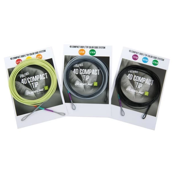 Guideline 4D Compact Tipper er laget for bruk med våre 4D Compact klumper (bodies). Men, de fungerer også utmerket til andre typer klumper og bakdeler av ulike vekter og fabrikater. I likhet med øvrige 4D tipper, har de en utmerket overrulling og kraft takket være sin unike design og nedtappering. Alle synkende varianter har dobbeldensitet for å sikre en rett og effektiv synkende linje i vannet. Guideline 4D Compact Tips har enestående overrulling når de kombineres med riktig type bakdel og lengde på fortommen.